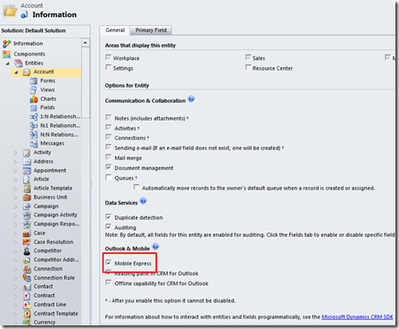 For example, if you want to enable Accounts for Mobile Express, go to Settings –> Customization –> Customize the System –> click on the Account entity, and make sure that the checkbox for Mobile Express is checked:
